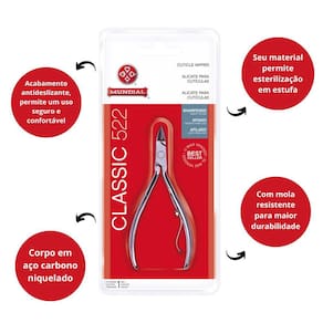 Amolecer a cutícula em água ou emoliente. Com o auxílio do Alicate Mundial Classic, retire a cutícula acompanhando o formato das unhas. Cuidado para não remover pele em excesso. Para melhor conservação de seu alicate evite quedas, mantenha-o seco, limpo e lubrificado.