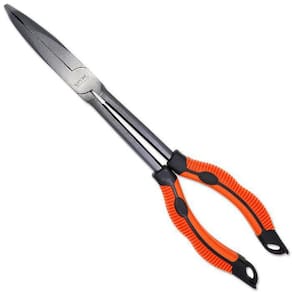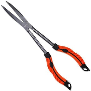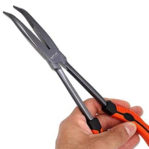 alicate desenvolvido pela v-fox, ideal para te acompanhar em todo tipo de pescaria. Utilizado para auxiliar no manejo de anzois e iscas. Por ter seu bico curvo, facilita a retirada de anzóis da boca dos peixes. Seu cabo é feito de borracha anti-derrapante. Indispensável em uma pescaria. Especificações: