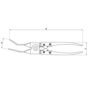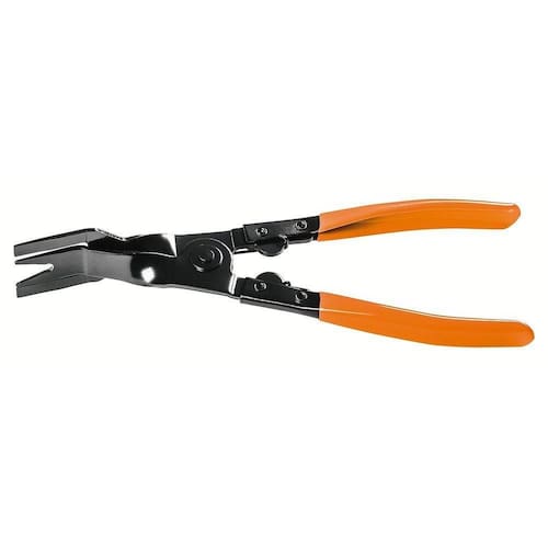 Corpo em aço carbono. Têmpera total no corpo. Cabo com revestimento plástico. Possui mola de retorno facilitando a utilização. Indicado para remover travas de fixação localizados em acabamentos internos e forração de automóveis. Tamanho: 240 mm