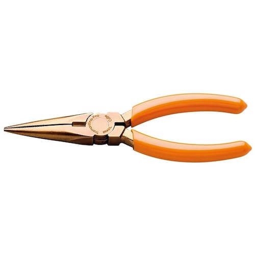 Alicate Ponta Chata em Cobre-Berílio 6 Tramontina PRO Antifaiscantes, anticorrosivas e não ferromagnéticas. Trabalhar em áreas de risco de explosão e fogo requer o máximo de proteção e segurança ao usuário. As ferramentas antifaiscantes da Tramontina PRO não geram faísca quando golpeadas ou utilizadas, não são ferromagnéticas e resistem à corrosão. A liga de cobre-berílio Utilizado nas ferramentas de segurança da Tramontina PRO possui resistência mecânica superior a outras ligas antifaiscantes disponíveis no mercado. A Tramontina PRO pode oferecer tamanhos e itens especiais além dos modelos que estão em linha. Um diferencial importante da linha de ferramentas antifaiscantes em cobre e berílio Tramontina PRO é sua durabilidade. Quem é PRO usa. Informações Gerais Forjado em liga de cobre-berílio e temperado. Mandíbulas usinadas. Cabos com revestimento especial. Dureza: 35-40 HRC. A liga de cobre-berílio, Utilizado nas Ferramentas de Segurança Tramontina PRO, possui resistência mecânica superior a outros materiais disponíveis no mercado. Ferramentas especiais: A Tramontina PRO pode oferecer tamanhos e itens especiais. Para mais informações, acesse tramontina.Com.Br/pro e envie sua solicitação. As ferramentas são produzidas e testadas conforme normas específicas. Uso seguro e adequado Use óculos, luvas e outros equipamentos de proteção individual EPIs de acordo com a tarefa a ser executada. Não lixar, usinar ou fundir as ferramentas de cobre-berílio CuBe para evitar exposição a vapores e partículas de berílio presentes na liga metálica. Sempre utilize uma ferramenta de bitola adequada ao parafuso ou porca. Não use tubos ou outras barras extensoras para obter mais torque. Ao aumentar a distância da aplicação da força gera-se mais torque no parafuso ou porca e na ferramenta, podendo quebrar ambos. Ferramentas em cobre-berílio são incompatíveis com o gás acetileno. Armazene em local limpo e seco. : 90 dias para vícios ou defeitos de fabricação. Marca: Não Informado