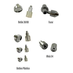 1 - Alicate Azul pintado com tinta automotiva, esse tipo de pintura garante que o alicate não vai perder a cor com o tempo. 1 - jogo de matrizes para furar 1 - jogo de Matrizes para aplicar botões plásticos de 10mm, 12mm e 15mm, esses botões podem ser Redondos, Coração, Estrela ou Flor. 1 - jogo de Matrizes para ilhós 54 1 - jogo de Matrizes para aplicar botão de metal de pressão N80. 1 - chave de fenda para troca de matrizes