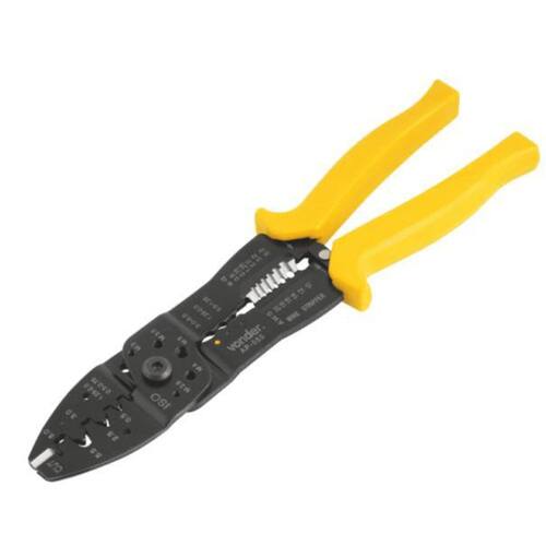 Alicate prensa terminais e corta fios AP055 Vonder Dimensões C x L x A : 9.00 x 30.00 x 2.50 centímetros Peso: 0.35 Kg Cabo plastificado Prensa terminais do tipo: - pré-isolados: fêmea, macho, forquilha garfo , anel e pino; - não isolados: anel e forquilha garfo Especificações Técnicas: Corta fios e cabos de bitolas 0,5 a 5,5 mm² Desencapa fios e cabos de bitolas 0,5 a 5,0 mm² Corta parafuso M2,6 - M3 - M4 e M5 Material do corpo do alicate: Aço carbono Acabamento do alicate: Pintado Comprimento total do alicate: 10 - 254 mm Tipo do cabo do alicate.: Cabo plastificado - E CDC : legal: 90 dias Marca: Não Informado Ean: 7893946151249