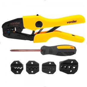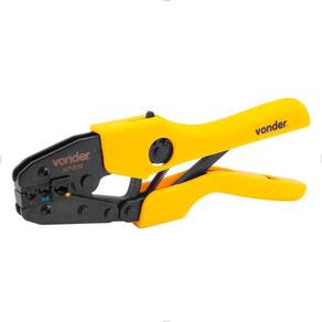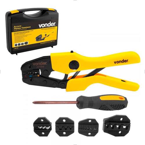 Ref.: 3686501000. Marca: Vonder. Modelo: AP 510. Material do corpo do alicate: Aço carbono. Acabamento: Pintado. Tipo do cabo do alicate: Cabo plastificado. Capacidade do alicate crimpador: 0,50 mm² a 6,0 mm² isolados e pré-isolado, 1,5 mm² a 6,0 mm² sem isolação e 10,0 mm² a 35,0 mm². Tipo de compressão: Catraca manual. Tipo de terminal: Terminais elétricos, tubulares pré-isolado e sem isolação. Matriz: Intercambiável. Massa aproximada (peso): 1,5 kg.