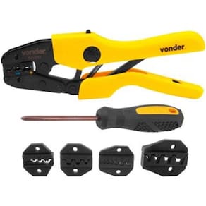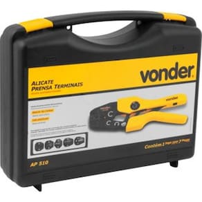 Alicate Prensa Terminal + Matriz 0.5 a 6mm Vonder AP-510 Possui regulador que libera o terminal após atingir a pressão pré-estabelecida e acompanha 5 mordentes, possibilitando uma série de trabalhos com medidas diferentes. Itens inclusos: - 1 alicate com 5 jogos de prensa terminais mordentes intercambiáveis - 1 jogo para prensar terminais tipo isolados 0,5 mm - 6 mm - 1 jogo para prensar terminais não isolados do tipo aberto de 0,5 mm - 6 mm - 1 jogo para prensar terminais tipo não isolados de 1,5 mm - 6 mm - 1 jogo para prensar terminais isolados e não isolados do tipo tubular 0.5 mm - 6.0 mm - 1 jogo para prensar terminais isolados e não isolados do tipo tubular 10 mm - 16 mm - 25 mm - 35 mm - 1 chave phillips Indicado para prensar terminais elétricos/eletrônicos tipo isolados 0,5 mm - 6 mm, terminais não isolados do tipo aberto de 0,5 mm - 6 mm, terminais não isolados do tipo aberto de 1,5 mm a 6 mm, terminais isolados e não isolados do tipo tubular 0.5 mm - 6.0 mm, terminais isolados e não isolados do tipo tubular 10 mm - 16 mm - 25 mm - 35 mm. Características técnicas: - Material do corpo do alicate: Aço carbono - Acabamento do alicate: Pintado - Comprimento total do alicate: 230 mm - Tipo do cabo do alicate.: Cabo plastificado - CDC : legal: 90 dias Código: 3686501000 / AP-510 Imagem ilustrativa. Marca: Não Informado