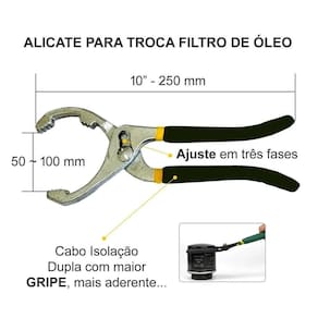 Alicate Chave Para Filtro de Óleo Ajustável 50-100mm Ferramenta ProfissionalO Alicate Chave para Filtro de Óleo é a ferramenta ideal para quem busca praticidade e eficiência na remoção de filtros de óleo e tubos de diferentes tamanhos. Com três níveis de ajuste, ele permite um encaixe preciso em filtros com diâmetros entre 50 e 100 mm, garantindo um trabalho mais seguro e sem danos à peça.Principais vantagens:- Versátil Além de filtros de óleo, pode ser utilizado em tubos de escapamento e sistemas industriais.- Alta resistência Produzido em aço forjado com acabamento cromo-níquel, garantindo maior durabilidade e resistência à corrosão.- Maior aderência Cabo emborrachado Soft de camada dupla, proporcionando mais conforto e firmeza durante o uso.Especificações Técnicas:Capacidade do Filtro: 50 a 100 mmComprimento Total: 10 (250 mm)Material: Aço forjadoAcabamento: Cromo-níquel (fosco)Cor do Alicate: PrateadoCabo: Verde com detalhe em amarelo, revestimento emborrachado Soft camada duplaAjuste: 3 níveis (50 - 100 mm)Peso: 328 gItens inclusos:- 01 Alicate Chave para Filtro de Óleo Ajustável 50-100mmIdeal para profissionais da mecânica e manutenção automotiva! Garanta já o seu!