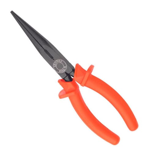 Produto fabricado em aço Gedore-Vanadium e empunhadura em polímero anti-chamas na cor laranja padrão Gedore. Acabamento escurecido. Empunhadura ergonômica e antideslizante, com abas protetoras arredondadas para maior conforto e segurança. Produzida por injeção, propiciando isolação até 1000 V, conforme norma NBR 9699, submetida à ensaios de: impacto, tensão elétrica, aderência, inflamabilidade e pressão. Utilizar este Alicate isolado, em tensão máxima de 1000 V em corrente alternada e 1500 V em corrente contínua, conforme norma NBR 9699. Atende com segurança a norma regulamentadora NR 10 - Segurança em Instalações e Serviços em Eletricidade, possui certificado de isolação. Tratamento térmico total e corte temperado por indução com dureza de 58 - 65 HRC. Alicate de bico semirredondo, longo e reto, com dentes finos e em paralelo, que permite cortar, puxar, segurar e dobrar fios. - Indicado para corte de arame com dureza média, diâmetro máximo de 1,6 mm e com resistência à tração 1600 N/mm². Indicado para trabalhar em montagens e reparos eletroeletrônicos.
