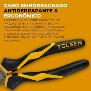 O alicate universal de 8" da TOLSEN é uma ferramenta robusta e versátil, essencial para uma ampla variedade de projetos profissionais e domésticos. Construído em aço de alta qualidade, este alicate oferece durabilidade e resistência para lidar com trabalhos exigentes. O cabo emborrachado proporciona conforto durante o uso prolongado e uma aderência segura, garantindo maior controle e precisão em cada tarefa. Além disso, sua construção ergonômica reduz a fadiga das mãos, permitindo trabalhar com eficiência por mais tempo. Uma característica importante deste modelo é o cortador lateral para arame, que oferece conveniência adicional ao realizar cortes rápidos e precisos de arames de diferentes espessuras. Essa funcionalidade torna o alicate ainda mais versátil e adequado para uma variedade de aplicações. Com sua ponta chata e mordida estriada, o alicate universal de 8" da TOLSEN é ideal para apertar, dobrar chapas e fios com facilidade e precisão. A abertura circular estriada no meio do alicate proporciona uma aderência firme em parafusos e dutos, garantindo um trabalho seguro e eficiente. A lâmina de corte afiada, permite cortar arames e fios finos e médios com facilidade, oferecendo maior praticidade e versatilidade em uma única ferramenta.