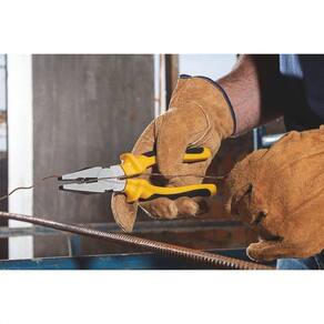 O Alicate Universal 8 Polegadas Isolado Tramontina em Aço Especial com Empunhadura Dupla Injeção auxilia nos pequenos reparos e na construção civil. Prático e versátil, esse alicate serve para as mais variadas operações. Indicado para locais com baixas tensões de até 1.000 V em corrente alternada. Além disso, traz mais resistência devido ao corpo forjado em aço especial e temperado. Uma ferramenta essencial para você ter por perto! Orientações Corpo forjado em aço especial e temperado. O aço carbono especial empregado na fabricação do produto, aliado à têmpera especial no gume de corte garantem maior resistência.Acabamento fosfatizado.Cabeça e articulação lixadas.Têmpera especial no gume de corte e mandíbulas.Produto em conformidade com a NBR 9699 e NR10. Isolação 1.000 V para uso em locais com baixas tensões de até 1.000 V em corrente alternada.Articulação suave para facilitar o uso.Os cabos possuem um formato ergonômico para aumentar o conforto.As ferramentas são produzidas e testadas conforme normas específicas. Características Gerais EAN13 7891114075588 DUN14 17891114075585 NCM 8203.20.10 Peso Líquido 0,3950 kg. Peso Bruto 0,3950 kg. Metragem 0,000608 m³. Dimensões Embalagem (Compr. X Larg. X Alt.) 270x 75x 30 mm. Dimensões Produto (Compr. X Larg. X Alt.) 201x 58x 13 mm. Cor 1 FFD200 Hexa Observações Use óculos, luvas e outros equipamentos de proteção de acordo com a tarefa a ser executada. Observe as indicações de uso de cada tipo de alicate ou torquês. Nunca utilize um alicate ou torquês para cortar arames endurecidos, a não ser que tenha sido projetado para este fim. Nunca utilize o alicate ou torquês como martelo. Ele pode trincar ou até mesmo quebrar. Nunca exponha os alicates ou torqueses ao calor excessivo. Isto pode alterar o tratamento térmico aplicado no corte e afetar o seu desempenho. Sempre posicione o corte do alicate ou torquês perpendicularmente ao eixo do arame para uma operação mais rápida e segura. Utilize alicates isolados, identificados pela marcação 1.000 V no cabo, quando for necessário trabalhar em locais com corrente elétrica. Importante: nestes casos, inspecione a integridade da isolação elétrica, e, se aparecerem trincas na isolação, suspenda o uso imediatamente.Nunca aumente o comprimento dos cabos dos alicates ou torqueses. Isto amplifica a força exercida sobre a cabeça da ferramenta podendo quebrá-la.Nunca utilize o alicate ou torquês em porcas e parafusos. Para estes trabalhos, indica-se o uso de chaves de aperto.Lubrifique periodicamente a articulação. Isto aumenta a vida útil do produto e melhora sua performance.Armazene em local limpo e seco.