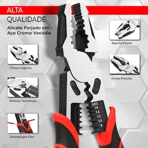 Alicate Universal 9 Pol. Multifuncional Corta Tudo Profissional Construído em Aço Cromo Vanádio, Alicatw Multifunção da Bravo Tools, atende com perfeição todas as suas necessidades: Corta, Decapa, Aperta, Prensa e muito mais. - Marca: Bravo Tools - Referência: AL09 - Tamanho: 9 polegadas 22,5cm - Fabricando em Aço Cromo Vanádio Forjado - 5 Funções: :: Lâmina de corte, corta tudo, para aço até 3mm e pregos até 8mm :: Chave inglesa :: Prensa terminais 2.5, 4, 6 e 8mm :: Desencapa fios de 1.5, 2.5, 4, 6 e 8mm :: Aperto firme multiuso - Com liga de alta resistência, é capaz de cortar até 10.000x sem perder o fio ou enfraquecer - Suas pinças foram projetadas para entregar o máximo de precisão e eficiência em seus trabalhos com alta aderência e fácil manuseio é até 10x mais poderoso que alicates comuns. - Com empunhadura ergonômica, fornece uma pegada firme e uma aderência incrível nas mãos, exigindo muito menos força para ser . - Peso: 400 gramas - : 90 dias