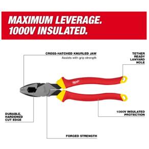 O Alicate de Eletricista Isolado 1000V 9" da Milwaukee oferece máxima alavancagem para cortes fáceis. A camada de isolamento de 1000V retardante de chamas nos cabos oferece máxima proteção. As bordas de corte em ferro carbono endurecido são projetadas para permitir que você corte materiais difíceis, como fios e ferragens, com facilidade. Todos os alicates são forjados para maior resistência. Este alicate de eletricista é classificado pela UL e certificado de acordo com os padrões IEC 60900 e ASTM F1505 para ferramentas manuais isoladas. Ele é respaldado pela Garantia Vitalícia Limitada da Milwaukee.