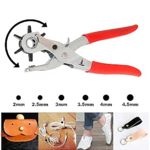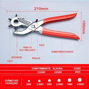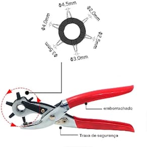 O Alicate Vazador Furador 9 Polegadas Lorben é fabricado em metal de alta resistência, possui roda giratória de 6 bicos com tamanhos diferentes de furo e cabo de borracha aderente com formato anatômico.É super fácil e rápido de usar. Escolha o tamanho, gire a roda, alinhe a peça e aperte.Indicada para furar couro, EVA, cintos, tapetes e outros materiais.Faz furos de 2mm, 2,5 mm, 3mm, 3,5mm, 4,mm, 4,5mm.[COMO USAR]Ao furar materiais finos, coloque uma camada de papelão mais resistente embaixo da peça que será furada. Isso permitirá uma maior profundidade de perfuração com mais facilidade. Pressione o alicate durante a execução do furo e gire-o para os lados antes de soltar. Assim o furo ficará perfeito.Marca: LorbenMaterial: Liga de AçoCor: Prata/VermelhoDimensões do produto:Comprimento: 21cmAltura: 10cmPeso: 260gTamanho do produto: 30x30x3cmPeso da embalagem: 284gCódigo do produto: GT6173Imagens ilustrativas. As tonalidades podem variar.Produto inclui book digital complementar, entregue eletronicamente após a compra. Ean: 7898707989765