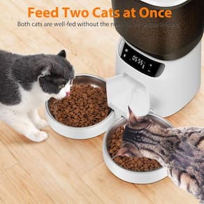 Alimentadores automáticos de gatos para 2 gatos - Alimente dois animais de estimação com facilidade: o alimentador automático duplo para gatos é projetado para servir dois animais de estimação simultaneamente. Seu inovador divisor de refeições garante uma distribuição uniforme de alimentos, evitando dis entre animais de estimação. Este alimentador automático de gatos para 2 gatos é ideal para donos de gatos que precisam sair para um fim de semana ou viagens curtas de negócios, mantendo os animais de estimação alimentados e felizes sem desconforto. Perfeito para quem procura um alimentador duplo automático para gatos que oferece tranquilidade para 2 animais de estimação felizes e bem alimentados. Observação: depois de definir o horário atual, salve-o primeiro e defina o número de refeições e horários de alimentação. Caso contrário, o tempo será adiado. - Armazenamento sem entupimento e de alta capacidade: este dispensador de comida para gatos possui um generoso recipiente de comida transparente de 5 L, permitindo que você programe mamadas para dois gatos por até 2 a 3 semanas. A grande capacidade minimiza a necessidade de recargas frequentes, e o design transparente permite que você monitore facilmente os níveis de alimentos em tempo real. Seja para um ou dois gatos, este dispensador automático de comida para gatos mantém você informado sobre quando é hora de recarregar, tornando a alimentação sem complicações - Chamada de refeição de voz personalizada: crie um vínculo com seus animais de estimação gravando até 10 segundos de sua voz para chamá-los para as refeições. Este alimentador automático para gatos permite que você reproduza sua mensagem gravada na hora da alimentação, incentivando melhores hábitos alimentares e fazendo seus animais de estimação se sentirem mais seguros. Com a função de alimentação manual, você também pode dar recompensas extras ao seu animal de estimação com o toque de um botão, tornando este alimentador automático para gatos interativo e conveniente - Tigela de aço inoxidável removível: o dispensador automático de comida para gatos está equipado com uma tigela de aço inoxidável de grau alimentício que é livre de odor e hipoalergênica, garantindo a saúde e a segurança de seus animais de estimação. Esta tigela removível e fácil de limpar ajuda a manter um ambiente de alimentação higiênico, reduzindo os riscos de alergias e promovendo o bem-estar a longo prazo. Perfeito para gatos, cães ou qualquer animal de estimação que precise de um dispensador de comida de gato limpo e seguro - Backup de energia e alimentação externa: seja alimentado por um adaptador ou 3 baterias de tamanho D (não incluídas), o alimentador automático para gatos garante uma alimentação confiável mesmo durante quedas de energia. Este alimentador automático para cães também pode ser colocado ao ar livre, atendendo a animais de estimação internos e externos. Garante alimentação consistente para seus animais de estimação, não importa onde você esteja, tornando-a a melhor escolha para donos de animais de estimação que gostam de desfrutar do ar livre sem se preocupar com o horário de alimentação de seus animais de estimação