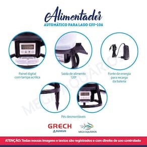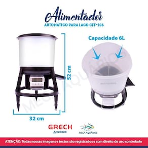 O alimentador automático Grech é perfeito para quem tem um lago e não consegue oferecer alimento regularmente, ele permite realizar até 6 alimentações diárias, ele é super prático e fácil de programar. Cada carga de bateria dura aproximadamente 3 meses.