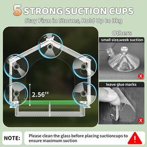 - ?Forte segurança de retenção? Com 5 ventosas grandes e resistentes, o alimentador de pássaros adere firmemente à sua janela, mas permanece fácil de tirar sem deixar marcas de cola. Projetado para ficar seguro na maioria das superfícies de vidro lisas. NOTA: Para máxima sucção, limpe o vidro antes de fixar as ventosas.