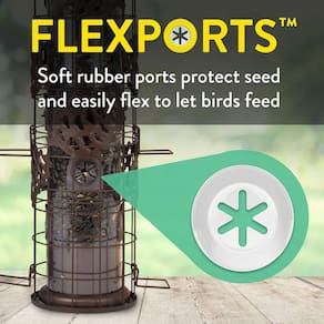 - Seis estações de alimentação com portas flexíveis evitam o derramamento de sementes e oferecem conforto para pássaros