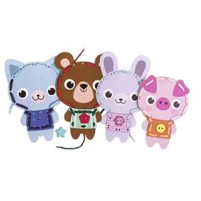 Os Alinhavos dos Bichinhos trabalham diversas habilidades como coordenação bilateral, movimento de pinça, coordenação motora fina de maneira lúdica e criativa. Recomenda-se a interação de um adulto. É um brinquedo seguro, durável e ecológico. Indicado para crianças a partir de 4 anos. Contém: 4 bichinhos para alinhavar, 8 acessórios roupinhas e botões , 8 cadarços coloridos. Tamanhos: urso e gato 24 x 15 cm, porco 22 x 15, coelho 27 x 15 cm Composição: madeira, papel Inmentro: CE-BRI/SARON-N 0135-19 NM 300/2002 OCP 0127 Referência 6050 Ean: 7898102626500