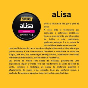 A cera alisa é formulada por carnaúba e polímeros sintéticos, isso é o que garante seu alto poder de brilho e alta resistência, podendo alcançar 3 a 6 meses de durabilidade variando de acordo com perfil de uso do carro, sua formulação não contém sílica visto que quimicamente é um componente favorável a aderência de manchas d'água, por isso, sua formulação entrega brilho, repelência com efeito hidrofóbico (efeito lótus), durabilidade e resistência.