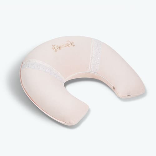 A Almofada de Amamentação Sublime, é na cor rosa com estampa bordada na frente e detalhes em renda branca.