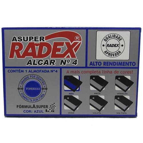 Almofada Carimbo Radex Azul Nr 04 - cor: azul - as almofadas para carimbo radex tem alto rendimento e fabricado com tinta de longa duração. - recarregável com tinta para carimbo radex tincar. Dados técnicos Composição: veículo aquoso aditivos e corantes Garantia contra defeito de fabricação Almofada para carimbo Radex recarregável nº 4 em estojo com tampa prática para evitar o ressecamento da tinta. Ideal para profissionais na autenticação de documentos, esta almofada pode ser recarregada com as tintas Radex 42ml. Disponível na cor azul, este produto possui alto rendimento e Fórmula Super, exclusiva da marca Radex. Medidas aproximadas do produto - Comprimento: 30 cm - Altura: 10 cm - Largura: 20 cm - Peso: 550 g