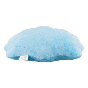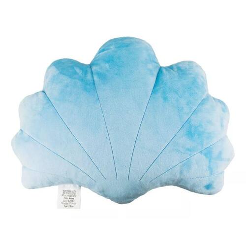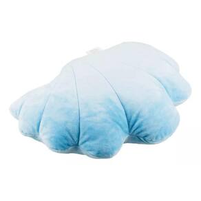 Almofada no formato de uma concha azul com 28 x 13 x 40 cm de dimensão. Material: poliéster; Enchimento: fibra de poliéster