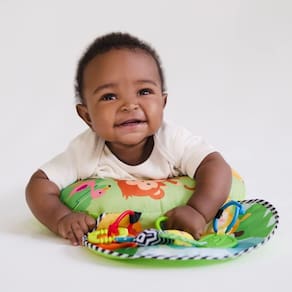 Com formato em meia-lua, a Almofada de Atividades da Buba é perfeita para o pequeno brincar de bruços com conforto.
