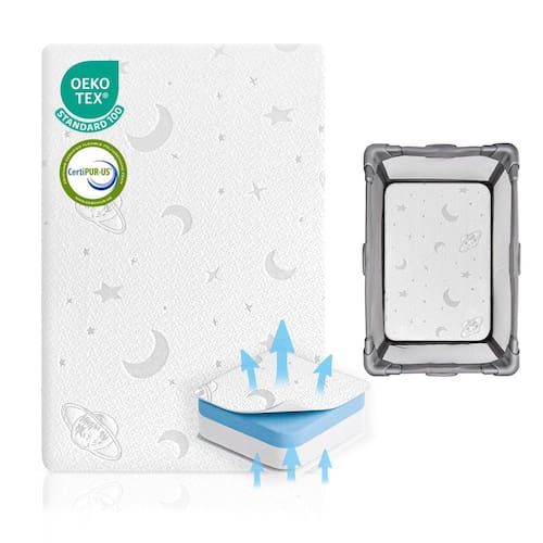 Design de dupla face. O lado mais firme é adequado para bebês, apoia a coluna e facilita o crescimento saudável. O lado viscoelástico é adequado para crianças pequenas, protegendo a coluna e aliviando a pressão corporal. Segurança e qualidade confiáveis. Uma capa externa protege o colchão contra vazamentos de fraldas, leite derramado, poeira, sujeira e muito mais. O protetor é feito de algodão orgânico, é suave para a pele do bebê, hipoalergênico, respirável, lavável e perfeitamente seguro para o meio ambiente. Ideal para o desenvolvimento de recém-nascidos. Macio e respirável, o chapéu se molda aos contornos do pescoço, costas e corpo do bebê. Ótimo para postura e crescimento. Os bebês podem dormir, se mover e rolar com segurança; eles também se beneficiam da rigidez da almofada ao aprenderem a se levantar, engatinhar e ficar em pé. Acreditamos que um bom colchão pode fazer toda a diferença para uma boa noite de sono, especialmente para bebês. Nosso foco simples está no seu bebê e, com características como roupa de cama macia e respirável, ele terá uma noite de sono mais segura, para que se sinta mais descansado e pronto para brincar. - Conforto para dormir - O colchão NEKSUN pack and play foi especialmente projetado para proporcionar a experiência de sono mais confortável para bebês. Este colchão para bebês é feito de espuma viscoelástica e espuma normal, macio e respirável, ajuda a proteger a coluna vertebral do bebê e a manter o corpo do bebê, trazendo conforto às costas, pernas e coluna do bebê para garantir um sono mais repousante e confortável. - Pack N Play feito sob medida — As dimensões deste colchão viscoelástico são 38 x 26 polegadas, serve apenas para o pack n play. Ele apresenta um design de borda arredondada para garantir um ajuste perfeito com os quatro cantos do berço, reduzindo as lacunas e proporcionando um espaço mais seguro para brincar e dormir para o bebê. - Capa jacquard ultramacia — A capa do colchão pack and play é feita de tecido respirável, reduzindo o ruído, e o design com zíper facilita a remoção e a lavagem na máquina. O lindo universo, as estrelas e o padrão da lua na capa são a escolha perfeita para decorar o quarto de um bebê. - Fácil de transportar - O colchão pack n play pode ser utilizado em ambientes fechados e também pode ser facilmente transportado para viagens. O mini colchão de berço é muito leve, permitindo que você o enrole e coloque no carro, para que o bebê tenha um sono de qualidade enquanto viaja. Você pode levar conforto aonde quer que vá - Para bebês - Os colchões pack n play têm certificação de espuma, garantindo o melhor em saúde e segurança. Seja para uma soneca curta ou uma noite inteira de sono, o colchão de berço pode proporcionar uma experiência de sono confortável para os bebês, ajudando-os a crescerem saudáveis. Leve nosso colchão pack play para casa e crie um espaço agradável para dormir para seus bebês!