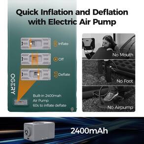 Almofada de dormir de acampamento autoinflável OGERY — O máximo conforto para aventuras ao ar livre One-Touch Inflation Magic Diga adeus às bombas manuais! Nosso colchão de acampamento possui uma bomba inteligente embutida que infla totalmente em apenas 40 segundos com um único toque de botão. A função de deflação rápida torna a embalagem igualmente fácil, pronta em 90 segundos. Luxuoso Memory Foam Comfort de 3,15" Experimente um sono com qualidade de hotel ao ar livre com nossa almofada de dormir ultra-grossa para acampar. A espuma viscoelástica premium se adapta ao seu corpo, enquanto o tecido de malha elástica 50D para uso externo oferece suporte durável durante toda a noite. Bomba removível e recarregável A poderosa bomba operada por bateria de 7,4 V 1200 mAh é removível e recarregável. Chega de procurar tomadas elétricas ou carregar equipamentos extras, basta a conveniência de acampar. Perfeita para campistas medindo 76,77" x 26,38" quando inflada (dobra para 27,56" x 10,63"), esta almofada de dormir de acampamento oferece conforto espaçoso enquanto permanece portátil. Com 5,95 libras, é ideal para acampar de carro, viagens de trailer ou roupa de cama para hóspedes. Desempenho em todas as estações Com um excepcional valor R de 9,5, nossa almofada de dormir isolada oferece uma regulação superior da temperatura, mantendo você aquecido no inverno e confortável no verão. Atualize sua experiência de sono ao ar livre hoje mesmo! A almofada de acampamento autoinflável OGERY oferece conforto incomparável onde quer que suas aventuras o levem.