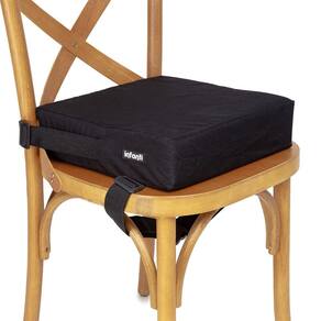 Almofada para uso como assento de elevação para refeições nas mesas dos adultos Tiras de fixação ajustáveis para uso seguro sobre diferentes modelos de cadeira Uso a partir dos 36 meses até 7 anos Capa removível e lavável Tecido aquablock: impermeável, resistente à ação do sol, durável e livre da formação de fungos Espuma densidade D28: muito macio e confortável