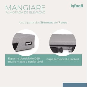Almofada para fixação na cadeira de adulto e uso durante as refeições. Confortável e prática, é impermeável e fácil de limpar.Se o seu pequeno já não é tão pequeno assim, mas está grande para as cadeiras de refeição tradicionais, a Mangiare vai dar essa ajudinha na hora das refeições para ele alcançar o prato, com muita segurança e conforto.Vale lembrar que criança já deve caminhar e conseguir sentar-se com total equilíbrio - a Mangiare é ideal para ser utilizada a partir dos 36 meses até os 7 anos. Prática para qualquer ocasião, ela tem faixa de fixação que se ajusta à cadeira de adulto, com fechamento de engate rápido.A Mangiare é produzida com tecido aquablock: tecnologia ecologicamente correta e material impermeável, resistente à ação do sol, durável e livre da formação de fungos. Para ainda mais praticidade, a capa é removível e de fácil limpeza. Para fazer a manutenção, você pode limpar diariamente com um pano úmido após as refeições.A criança deve estar sempre sob a supervisão de um adulto ao utilizar o assento de elevação.