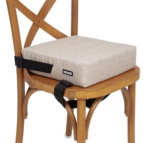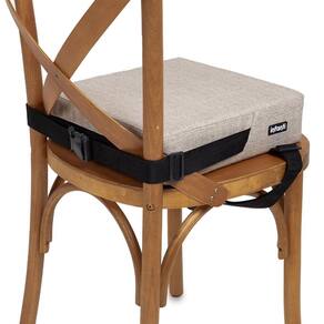 Almofada para uso como assento de elevação para refeições nas mesas dos adultos Tiras de fixação ajustáveis para uso seguro sobre diferentes modelos de cadeira Uso a partir dos 36 meses até 7 anos Capa removível e lavável Tecido aquablock: impermeável, resistente à ação do sol, durável e livre da formação de fungos Espuma densidade D28: muito macio e confortável