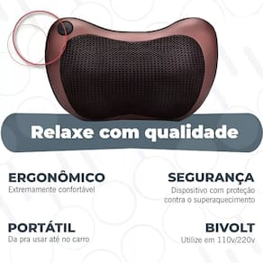 Almofada De Massagem Eletrônica Costas Pescoço Ombro BivoltAlmofada de massagem eletrônica aquecimento eletrônico, almofada de massagem amassar costas pescoço ombro Bivolt Almofada Massageadora possui um mecanismo como 2 pares de roldanas, realizam movimentos suaves e repetitivos na região que esta recebendo a massagem.