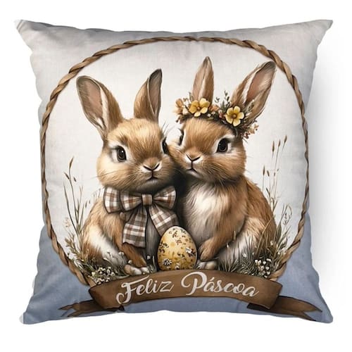 Contém: 1 Almofada com enchimento em fibra siliconada. Tamanho: 43 x 43 cm Material: Veludo Detalhes: Sem aplicações Fechamento: Zíper Invisível Forma: Quadrada Cor: Azul, bege e marrom Estampa frente: Casal de Coelhos Estampa verso: Casal de Coelhos Produto: Nacional