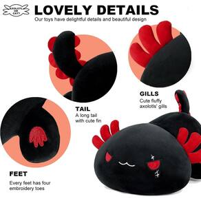 Os brinquedos de pelúcia Devil Axolotl têm uma expressão fofa, cauda enrolada e bom toque. - Material: o Axolotl de pelúcia é preenchido com algodão elástico que é mais macio do que o normal. Os tecidos que não agridem a pele proporcionam uma melhor sensação de toque na pele e tornam o travesseiro macio e confortável. - Tamanho: 13" (a medição manual pode ter um erro de 0,5 a 1,5 polegadas). O travesseiro tem um tamanho adequado, o que é uma sensação perfeita para abraçar. - Adequado: crianças/famílias/amigos/parentes não podem perder! Ótima opção para abraçar o travesseiro de cama para adultos e crianças. Adequado para quarto, sala de estar, família, escritório, etc. - Melhor presente: surpreenda seus amigos com esta adorável, exclusiva e macia almofada de brinquedo de pelúcia. - Nota importante: Este gatinho de pelúcia vem embalado a vácuo e plano, mas pode ser facilmente afofado colocando-o ao sol ou na secadora para uma melhor recuperação total.