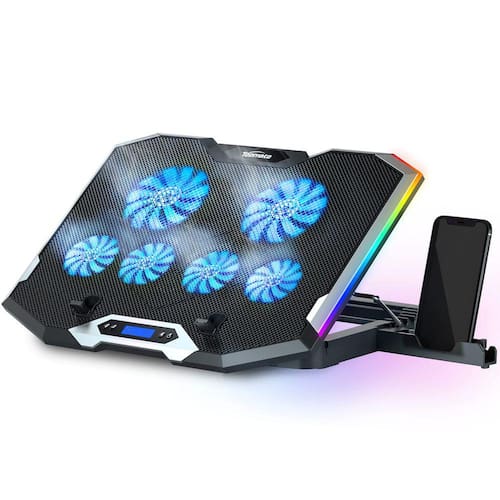 ?Ventilador silencioso?Os 6 ventiladores do suporte de resfriamento do laptop são todos adicionados com componentes de capacitor para reduzir o ruído de trabalho. Ao mesmo tempo, a velocidade do ventilador não será reduzida e nenhum ruído irritante. Dicas: Use o plugue de carregamento USB de 5V/8V para fonte de alimentação, a velocidade do ventilador será mais forte!