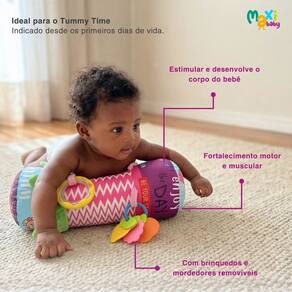 Com um design ergonômico em formato de cilindro, ela serve de apoio confortável enquanto o bebê exercita os músculos do pescoço, braços e peito. O visual vibrante e os acessórios interativos garantem que a curiosidade seja aguçada, mantendo o bebê engajado e feliz por muito mais tempo.