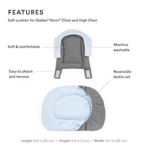 Almofada Stokke Nomi (azul cinza) — ADICIONA CONFORTO — As almofadas Stokke Nomi adicionam suavidade à cadeira Nomi, com ou sem o conjunto de bebê Stokke Nomi. - VERSÁTIL - Não importa a cor que você escolher, a almofada Nomi ajuda a adicionar um pouco de personalidade à sua decoração. Além disso, cada almofada é reversível, então você pode misturá-la quando precisar de uma troca. - FÁCIL DE USAR - A almofada é fácil de colocar e remover. Melhor ainda, é lavável à máquina, então você não precisa se preocupar com essas bagunças inevitáveis. - DESIGN COM UM PROPÓSITO - A Stokke entrou no setor de móveis e acessórios infantis em 1972 e, desde então, todos os nossos produtos foram projetados para desafiar o comum, promover o desenvolvimento saudável e estimular o vínculo familiar.