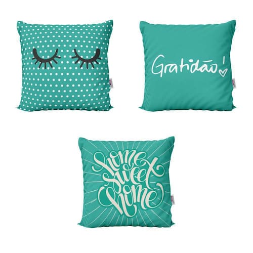 Almofadas Azul Turquesa Gratidão Home Sweet Home Para Sofá 40x40 - Novadecora Decorar sua casa com lindas Almofadas é aliar conforto e personalidade. E não existe sensação melhor do que poder chegar em casa depois de um dia cansativo de trabalho e curtir o aconchego do nosso lar. E por falar em aconchego, um item que transmite muito bem isso são as Almofadas Decorativas que você encontra na Novadecora. Se você é daqueles que adora decoração e gosta de deixar a sua casa com a sua personalidade, aqui na Novadecora é o lugar ideal para encontrar as almofadas mais lindas, dos mais variados estilos. Kit Com 3 Almofadas Decorativas em impressão digital com estampa exclusiva frente e verso TECIDO Capa confeccionada em tecido Oxford 100% poliéster, um tecido de ótima qualidade e durabilidade. O Oxford proporciona mais conforto e um toque agradável, além das cores ficarem mais vivas deixando seu ambiente mais decorado. Características e especificações: Marca: Novadecora Almofada já cheia Pronta para uso Almofada lavável - sem perder a qualidade e impressão Zíper invisível Dimensões lxa 40x40 cm É produto personalizado: Sim Conteúdo da embalagem 3 almofadas com enchimentos Importante sobre lavagem: - Lavar manualmente com sabão neutro - Temperatura máxima de lavagem 40°C. - Não usar alvejante. - Secar a sombra. - Temperatura máxima de base do ferro 110°C. - Não limpar a seco. : Três meses contra defeitos de fabricação. As cores das estampas podem variar de acordo com a calibração do seu monitor. AVISO: Não nos responsabilizaremos pela diferença de cores em caso de pedidos feitos separadamente, no caso produzidos em lotes diferentes. Marca: Novadecora Ean: 6015246334301