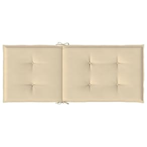 - Cor: bege- - Material: tecido (100% poliéster) - - Material de enchimento: fibra de espuma- - Dimensões (cada): 47,2" x 19,7" x 1,2" (C x L x T) - - Comprimento da corda (cada): 11,8"- - Com 1 alça elástica e 2 conjuntos de cordas- - Adequado para cadeiras com encosto alto- - À prova d'água- - A entrega contém: - - 4 almofadas de cadeira de jardim -- - Proposição 65 da Califórnia