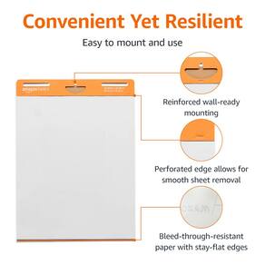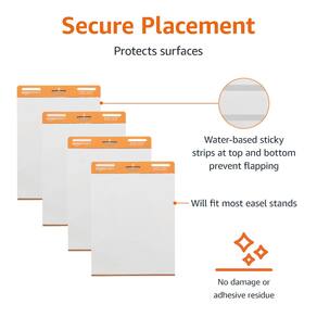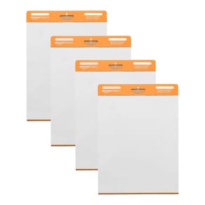 Amazon Basics Blocos de mesa flip de cavalete pegajosos, retangulares, pacote com 4, 63 x 76 cm, branco - Almofada de cavalete para apresentações de trabalho, sessões de brainstorming, exercícios em sala de aula e muito mais - Inclui 2 blocos de cavalete com 30 folhas de papel por bloco (60 folhas no total) - Adesivo de microesfera à base de água na parte traseira, inadequado para paredes ásperas, facilmente para suavizar superfícies como portas de madeira, vidro, quadros brancos, quadros negros e metal - Remove sem esforço da almofada, mas permanece pegajosa nas superfícies; não danifica superfícies ou deixa resíduos de adesivo - Papel resistente a sangria sem bordas onduladas; para uso com marcadores, canetas, giz de cera e outras ferramentas de escrita - A borda perfurada permite a remoção limpa e fácil da folha - Suporte resistente com furos para pendurar; cabe na maioria dos suportes de cavalete - Dimensões do produto: 63,5 x 76,2 x 0,7 cm (CxLxA)