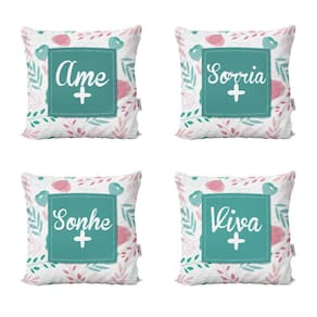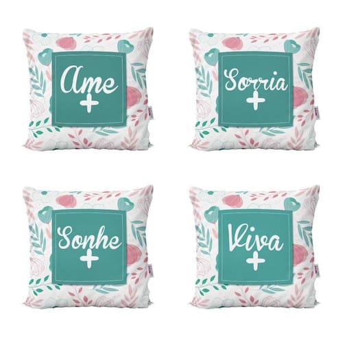 Almofadas Personalizadas Ame, Sorria, Sonhe, Viva Para Sofá 40x40 - Novadecora Decorar sua casa com lindas Almofadas é aliar conforto e personalidade. E não existe sensação melhor do que poder chegar em casa depois de um dia cansativo de trabalho e curtir o aconchego do nosso lar. E por falar em aconchego, um item que transmite muito bem isso são as Almofadas Decorativas que você encontra na Novadecora. Se você é daqueles que adora decoração e gosta de deixar a sua casa com a sua personalidade, aqui na Novadecora é o lugar ideal para encontrar as almofadas mais lindas, dos mais variados estilos. Kit Com 4 Almofadas Decorativas em impressão digital com estampa exclusiva frente e verso TECIDO Capa confeccionada em tecido Oxford 100% poliéster, um tecido de ótima qualidade e durabilidade. O Oxford proporciona mais conforto e um toque agradável, além das cores ficarem mais vivas deixando seu ambiente mais decorado. Características e especificações: Marca: Novadecora Almofada já cheia Pronta para uso Almofada lavável - sem perder a qualidade e impressão Zíper invisível Dimensões lxa 40x40 cm É produto personalizado: Sim Conteúdo da embalagem 4 almofadas com enchimentos Importante sobre lavagem: - Lavar manualmente com sabão neutro - Temperatura máxima de lavagem 40°C. - Não usar alvejante. - Secar a sombra. - Temperatura máxima de base do ferro 110°C. - Não limpar a seco. Garantia: Três meses contra defeitos de fabricação. As cores das estampas podem variar de acordo com a calibração do seu monitor. AVISO: Não nos responsabilizaremos pela diferença de cores em caso de pedidos feitos separadamente, no caso produzidos em lotes diferentes. Marca: Novadecora