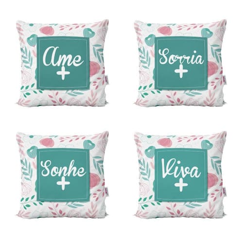 Almofadas Personalizadas Ame, Sorria, Sonhe, Viva Para Sofá 40x40 - Novadecora Decorar sua casa com lindas Almofadas é aliar conforto e personalidade. E não existe sensação melhor do que poder chegar em casa depois de um dia cansativo de trabalho e curtir o aconchego do nosso lar. E por falar em aconchego, um item que transmite muito bem isso são as Almofadas Decorativas que você encontra na Novadecora. Se você é daqueles que adora decoração e gosta de deixar a sua casa com a sua personalidade, aqui na Novadecora é o lugar ideal para encontrar as almofadas mais lindas, dos mais variados estilos. Kit Com 4 Almofadas Decorativas em impressão digital com estampa exclusiva frente e verso TECIDO Capa confeccionada em tecido Oxford 100% poliéster, um tecido de ótima qualidade e durabilidade. O Oxford proporciona mais conforto e um toque agradável, além das cores ficarem mais vivas deixando seu ambiente mais decorado. Características e especificações: Marca: Novadecora Almofada já cheia Pronta para uso Almofada lavável - sem perder a qualidade e impressão Zíper invisível Dimensões lxa 40x40 cm É produto personalizado: Sim Conteúdo da embalagem 4 almofadas com enchimentos Importante sobre lavagem: - Lavar manualmente com sabão neutro - Temperatura máxima de lavagem 40°C. - Não usar alvejante. - Secar a sombra. - Temperatura máxima de base do ferro 110°C. - Não limpar a seco. : Três meses contra defeitos de fabricação. As cores das estampas podem variar de acordo com a calibração do seu monitor. AVISO: Não nos responsabilizaremos pela diferença de cores em caso de pedidos feitos separadamente, no caso produzidos em lotes diferentes. Marca: Novadecora Ean: 6015246335377