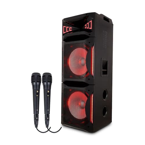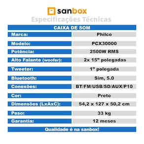 São 2500W RMS de pura potência. A Philco PCX 30000 é equipada com dois woofers de 15” polegadas e um tweeter de 1” polegadas. Ela não possui bateria interna e funciona sendo alimentada por energia elétrica. Atenção! Selecione a tensão correta no aparelho antes de conectá-lo à rede.