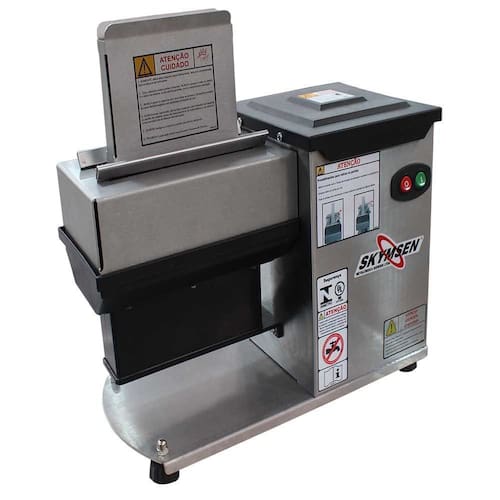 Amaciador de Carne Inox ABS Skymsen. Ideal para açougues, cozinhas industriais e supermercados, o amaciador de carne elétrico da Skymsen é produzido em Aço Inox, tendo os rolos acoplados em sua tampa, podendo ser removidos na hora da limpeza, o que facilita o processo de higienização do equipamento. Além dessas vantagens, para trazer ainda mais versatilidade ao seu estabelecimento. Carnes macias e saborosas fazem toda a diferença na hora de preparar uma boa refeição. É exatamente isso que os consumidores procuram na hora de escolher a carne para comprar. Para atender essa demanda, contar com o amaciador de bife elétrico da Skymsen fará toda a diferença para garantir a satisfação de seus clientes. O amaciador de carne elétrico da Skymsen funciona através de um rolo com lâminas que atravessam a carne e quebram suas fibras, deixando-a mais fina e fácil de consumir. Além disso, os furos realizados pela máquina, faz com que a carne absorva com maior facilidade os temperos, contribuindo para o seu melhor sabor. Seu uso é recomendado para todos os tipos de carne de gado sem ossos. POTÊNCIA NOMINAL(127V): 550W. POTÊNCIA DO MOTOR(127V): 0,5CV. CONSUMO(127V): 0,55 kW/h. PRODUÇÃO APROXIMADA: 500 kg/h. ESPESSURA MÁXIMA DE CORTE: 2cm. LARGURA MÁXIMA DE CORTE: 17cm. PESO: 29,50 kg. DIMENSÕES(CxAxL): 56x51x34cm. Amaciador de Carne Inox ABS Skymsen é na OverFrio.