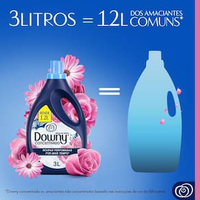 ^ Downy concentrado vs. amaciantes não concentrados baseado nas instruções de uso do fabricante Baseado em provas realizadas com conjunto de odores representativos. Baseado em dados Nielsen Brasil, para o ano de 2021 * Concentração de perfume depositada e liberada do tecido seco medida por métodos analíticos vs. amaciantes não concentrados