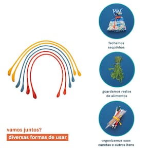 ":: Esse é o conjunto com 6 amarradores de silicone da OIKOS. :: Muito versáteis: eles servem para rechear alimentos, fechar saquinhos e agrupar diferentes itens - na cozinha ou no resto da casa, você que manda. :: Maleáveis, longos e resistentes: são boas alternativas ao uso de palitos de dente, arames e cordas durante o preparo de alimentos. :: Versátil e seguro: como o silicone vai no forno e no freezer, um leque de receitas é possível - e sem essa de se machucar com um palito de dente deixado para trás na comida! :: Durante o preparo: são usados para manter a comida bem juntinha, como rocambole, frango recheado, peru de natal e mais."