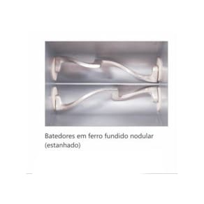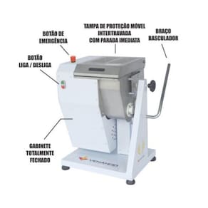 A Amassadeira Basculante Semi-rápida conta com tampa de proteção móvel intertravada através de duas chaves eletromecânicas com acionamento individual atuando na proteção do equipamento. Seu tacho é em aço inox jateado e conta com batedor de ferro fundido nodular estanhado e toda sua estrutura é feita de chapa reforçada SAE1010/1020 com acabamento em pintura a pó eletrostática com base fosfatizada.