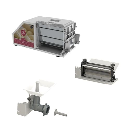É um aparelho 4 em 1: amassadeira, cilindro, extrusor e moedor, oferecendo grande versatilidade.