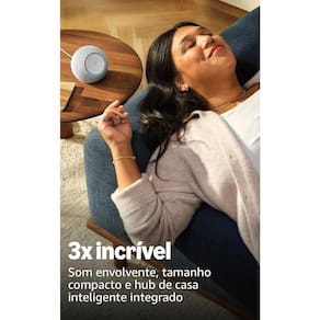 Um dispositivo totalmente novo em nossa linha que leva o áudio do Echo Dot ao máximo, oferecendo um som rico e envolvente que preenche todo o ambiente e se ajusta automaticamente ao seu espaço, ajustando a reprodução. E ainda vem com um hub de casa inteligente integrado.