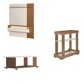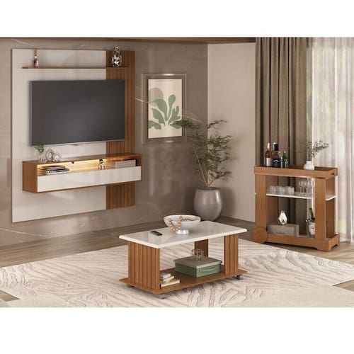 Painel Matisse compatível com TVs de até 65?, ele combina segurança e estilo para elevar a experiência do seu ambiente. A fita de LED dentro do nicho cria uma iluminação sutil e acolhedora, enquanto a porta basculante com amortecedor e o puxador chanfrado oferecem praticidade e elegância. Eleve seu ambiente com o Carrinho Bar Rosé: Compartimentos amplos para armazenar garrafas, copos e acessórios, garantindo praticidade na hora de servir suas bebidas favoritas. Detalhes em rodas: Rodízios facilitam o deslocamento do carrinho. Fita de borda metalizada. A Mesa de Centro Mila é o toque final que sua sala merece. Seu tampo de MDF de 25cm com bordas arredondadas e delicados frisos adicionam uma elegância discreta ao ambiente. Acabamento: Pintura UV Altura do Conjunto: 180 cm Ambiente: null Ambiente Principal: Sala de Estar Cor: Cinamomo/Off White Informação Complementar: 1x Carrinho Bar com Rodizios com Fita Metalizada Rodas Cinamomo/Off White Largura: 80 cm Altura: 80 cm Peso: 14,2 kg Profundidade: 32 cm Necessita Montagem: Sim