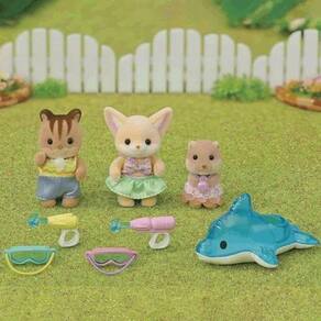 O trio de bebês na piscina é um conjunto composto por 3 estatuetas de bebê (o bebê Esquilo Vermelho, o bebê Fennec e o bebê lontra) e seus acessórios para um dia na piscina: 2 pistolas de água, 2 máscaras de mergulho, 1 boia de golfinho.